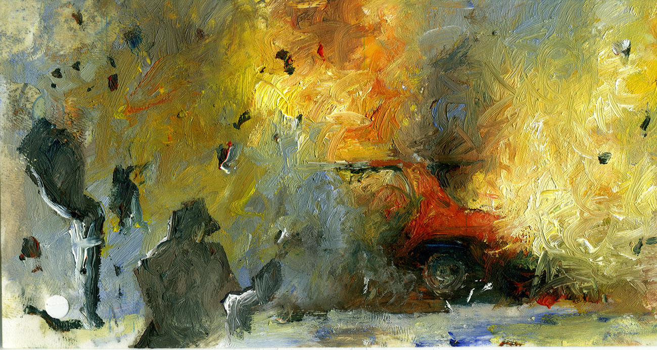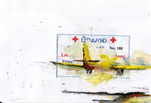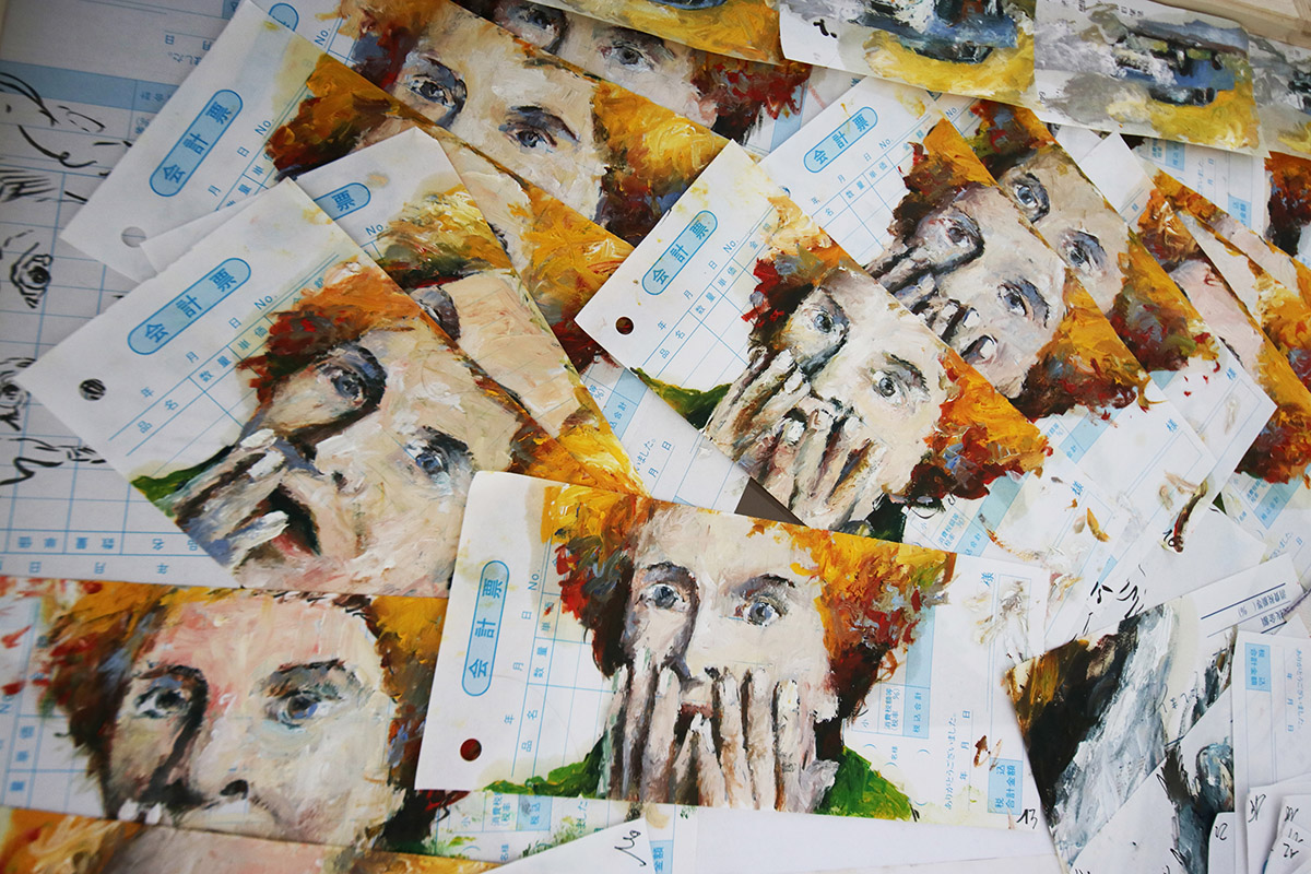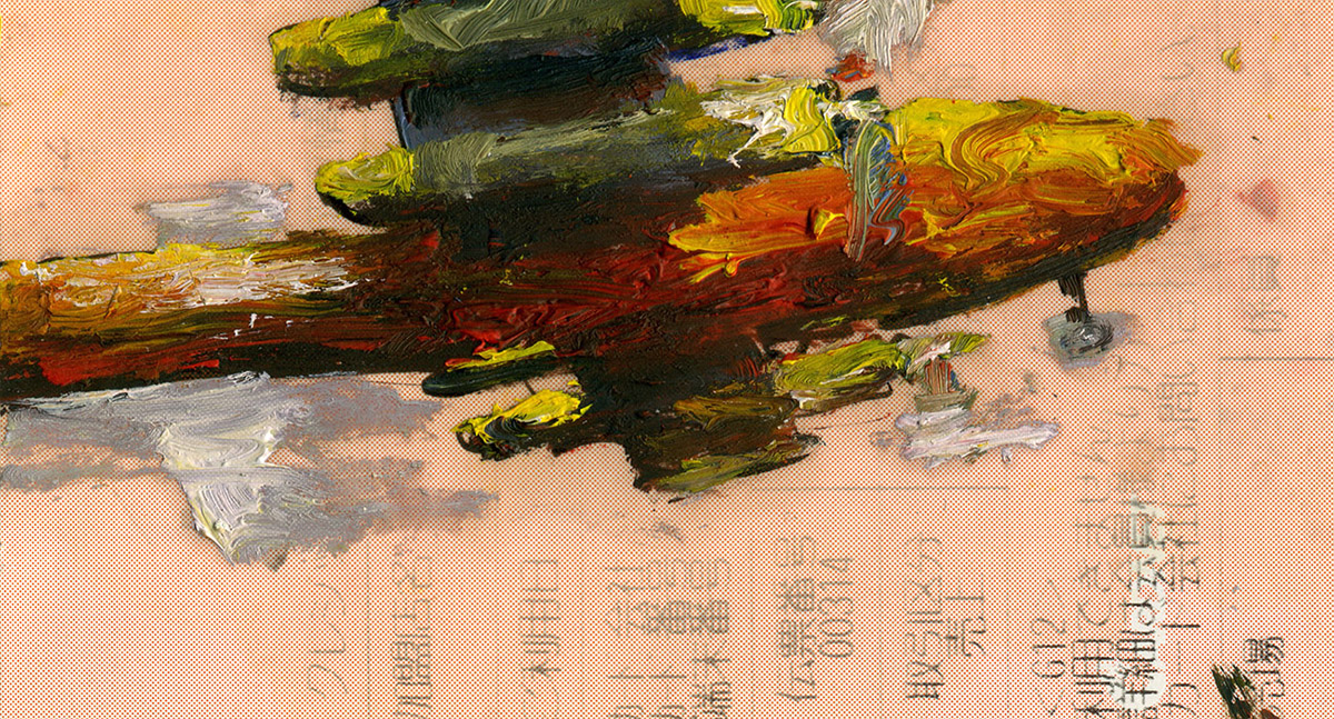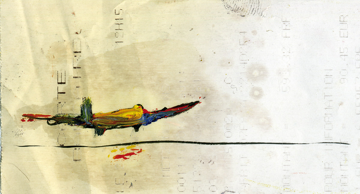 A Movie reprend le titre d’un film célèbre de Bruce Conner réalisé en 1958. Il n’en est pas le remake, mais évoque l’un de ses principes consistant à produire, à partir d’images trouvées, le sentiment d’une montée progressive de la catastrophe. Toutes les peintures sont réalisées sur des bouts de papiers récupérés au hasard de voyages : notes d’hôtel, facturettes, bulletins, vieux carnets, journaux, cahiers d’écoliers, pour la plupart collectés en Asie, au Japon, au Cambodge, au Laos, au Vietnam en particulier. Cris, exposions, courses éperdues, scènes de paniques, voitures lancées à pleine vitesse, développent une tension soutenue, sans qu’un récit constitué se mette en place. La succession de papiers imprimés servant de subjectiles agit comme un flicker en imposant une pulsation rythmique à l’ensemble de la séquence. Les supports entrent en collision semblant vouloir eux-même accélérer le mouvement des figures qu’ils contiennent. Souvent minuscules, de la taille d’un ticket de caisse, ils peuvent se révéler monumentaux à l’écran, manifestant de façon paradoxale la réalité de la production initiale.