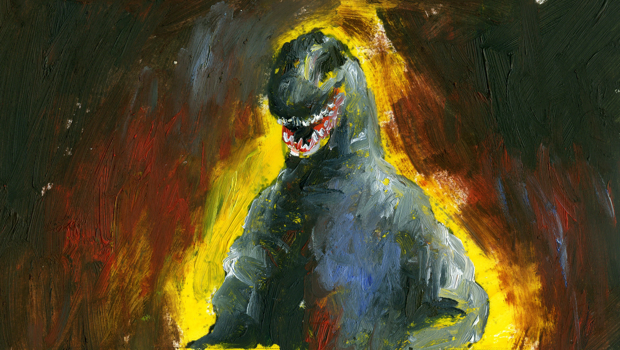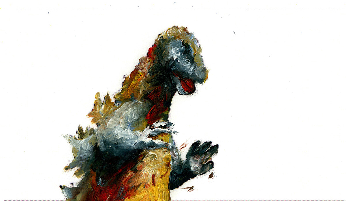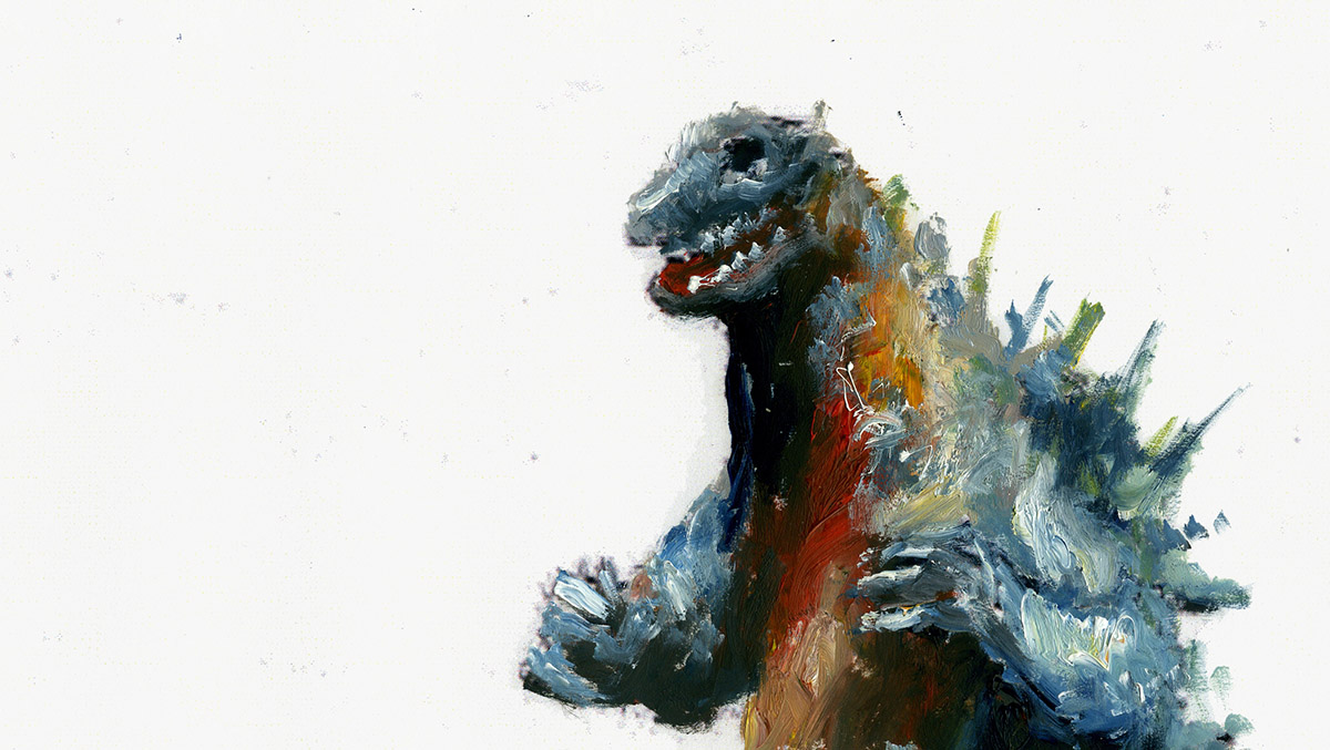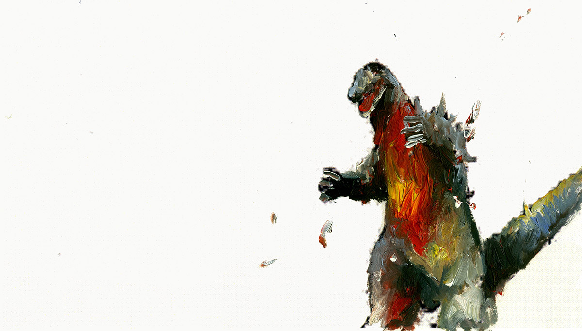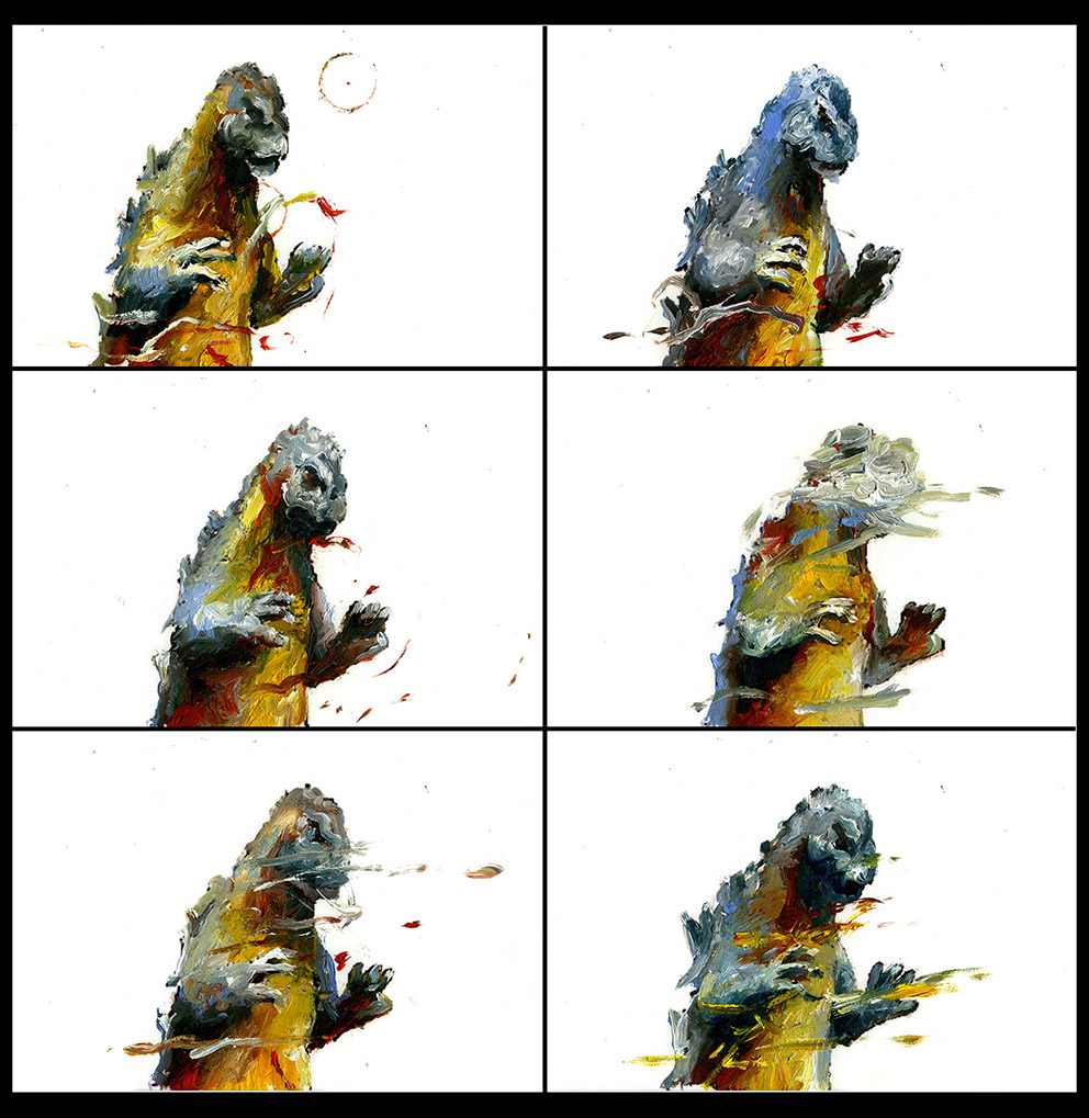 Transformé en une créature de couleur à l’aspect instable, Godzilla devient un personnage dont la menace tourne à vide ; ses tics resurgissent, mais au sein de ce nouvel espace pictural ils se manifestent comme dans une pantomime. L’isolement de la figure, l’effacement du contexte original, révèlent incidemment la part d’humanité de Godzilla, qui ne se déplace jamais à la manière d’un animal ; à travers la gestuelle du monstre, agitant les bras et marchant comme un homme, c’est la présence de l’acteur à l’intérieur d’un costume de caoutchouc en forme de bête antédiluvienne qui se rappelle à nous. La créature déplacée, repeinte, transformée, reste habitée par le personnage fantôme placé à l’intérieur qui lui donnait vie dans les premiers films de la série.