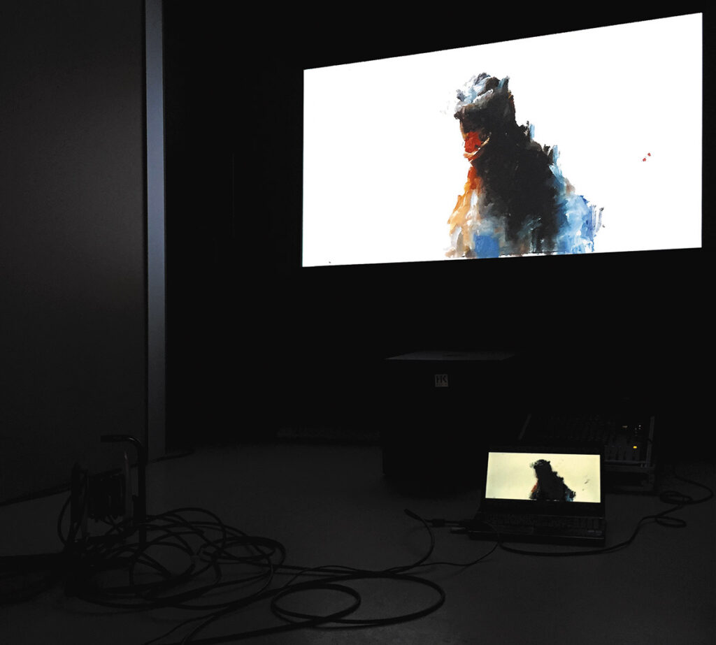 Godzilla reloaded  est un film en papier réalisé à partir de très brèves séquences soustraites à la longue série des « Godzilla » produite au Japon depuis les années 1950. Les fragments collectés sont décomposés en images fixes, transformant les films en une base de données dans laquelle on peut s’engager librement sans souci d’une ligne narrative cohérente ou d’une position chronologique. Reprises numériquement pour une nouvelle configuration des formes et des mouvements, ces images deviennent des peintures, formant une succession de tableaux peints, qui constituent la matrice d’un film. Le choix de techniques très grasses apporte au travail de nombreuses taches, scories, y compris un halo formé d’huile séchée apparaissant parfois autour des figures, comme un méta-dessin venant en plus. Dans le film, ces traces bougent aussi, rappelant incidemment les salissures ou l’usure des pellicules de cinéma. Le geste qui se développe de manière sensiblement différente entre les images, donne le sentiment que l’image se fait et se défait sans arrêt, dans une animation de la surface même, à la limite du flicker.
