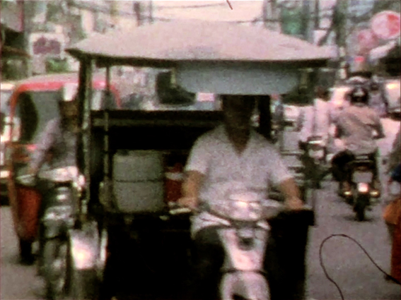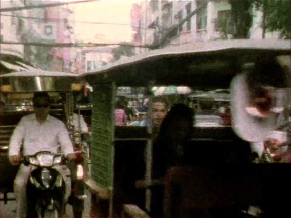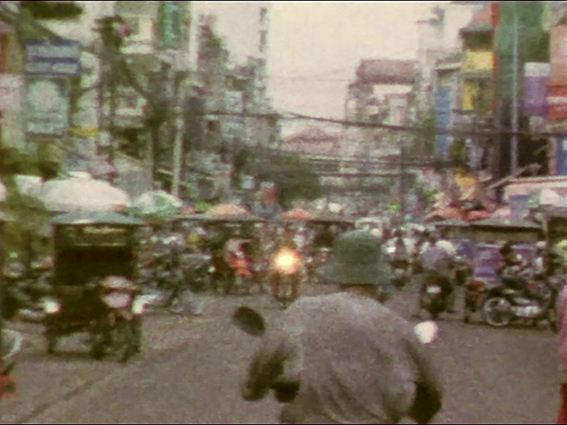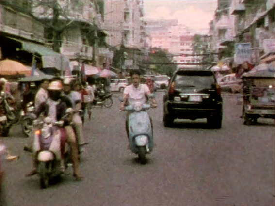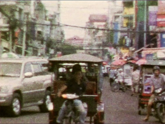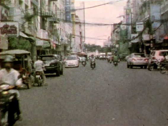 Phnom Penh 18/24 a été tourné en super 8 à Phnom Penh sur un mode performatif. Placé au milieu de la rue, j’enclenche le zoom électronique de la caméra pour aller à la rencontre du point de fuite, en parcourant la ville par de courtes étapes. Placées bout à bout, les séquences tracent à travers l’espace une longue ligne droite. La trajectoire qui se déploie est ici un mouvement fictif puisque l’opérateur reste immobile et laisse agir l’appareil. Entre chaque moment s’intercalent 3 images en rupture, dont un photogramme blanc ; le montage produit ainsi un sursaut après chaque zoom, accélérant la dynamique comme si l’ensemble était propulsé par une mécanique interne.