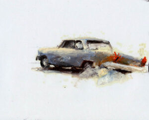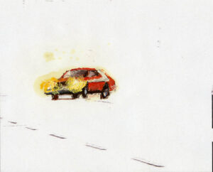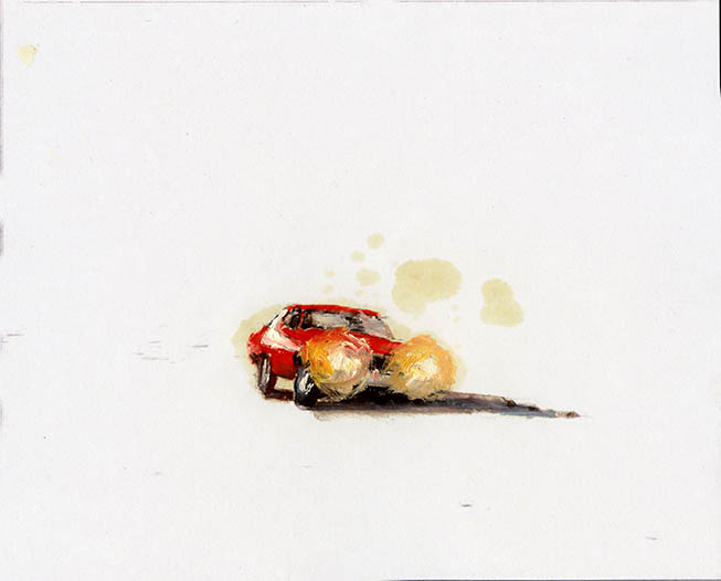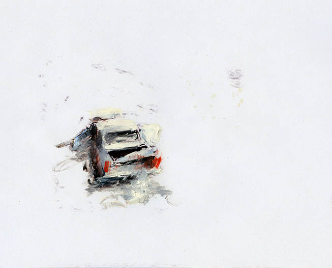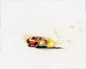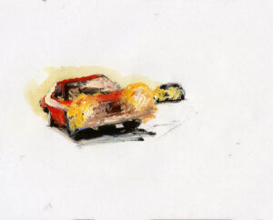 STRASKI est la synthèse picturale de la série télévisée Starsky et Hutch (1975-1979), réduite au seul mouvement automobile. Le déplacement y perd toute destination pour se transformer en une chorégraphie muette, rythmée par les tensions provoquées par le passage des voitures. Des vitesses différentes semblent se superposer : la vibration de la couleur, l’action des véhicules, les auréoles de graisse laissées par la peinture, les traces, les frémissements de la surface elle-même articulent une temporalité disloquée où le flux d’images progresse dans une constante instabilité. La « voiture » n’est pas tant ici le sujet que l’opérateur plastique d’un pur défilement.